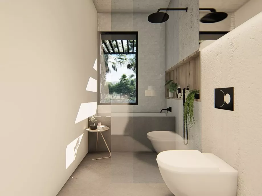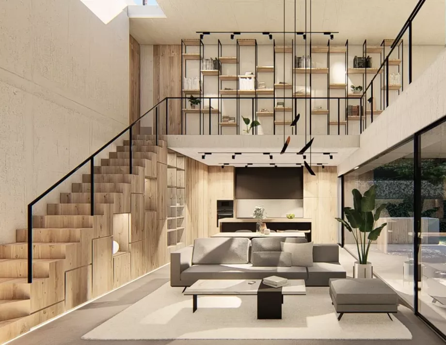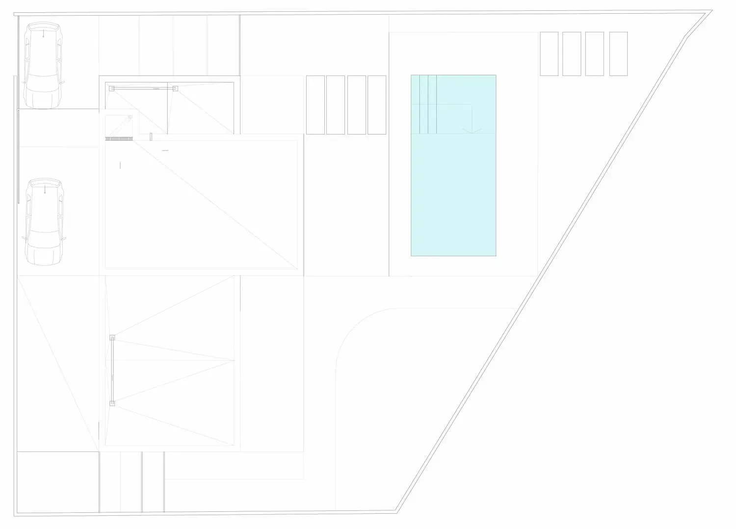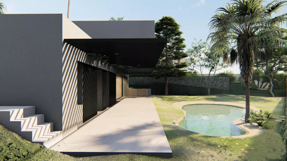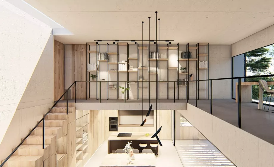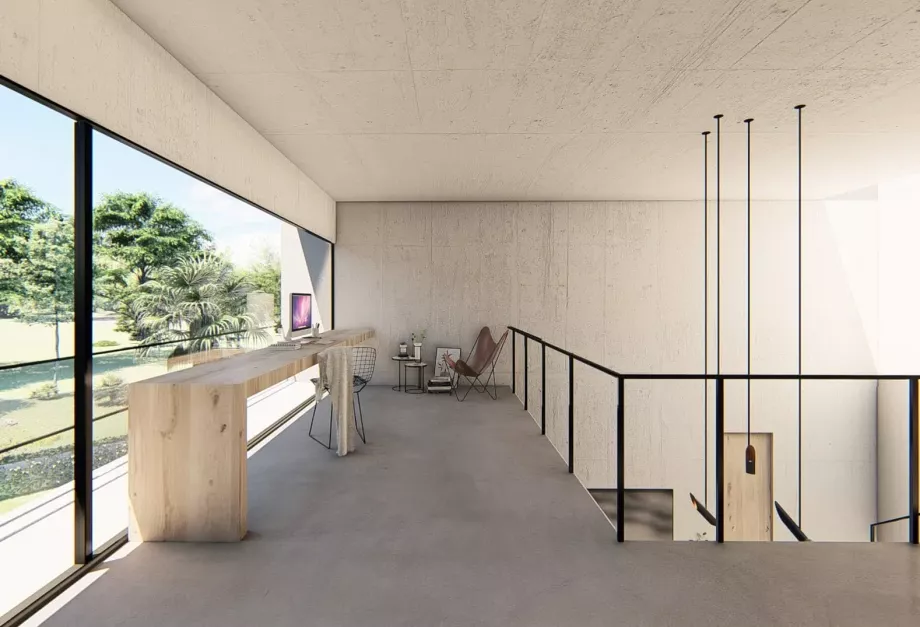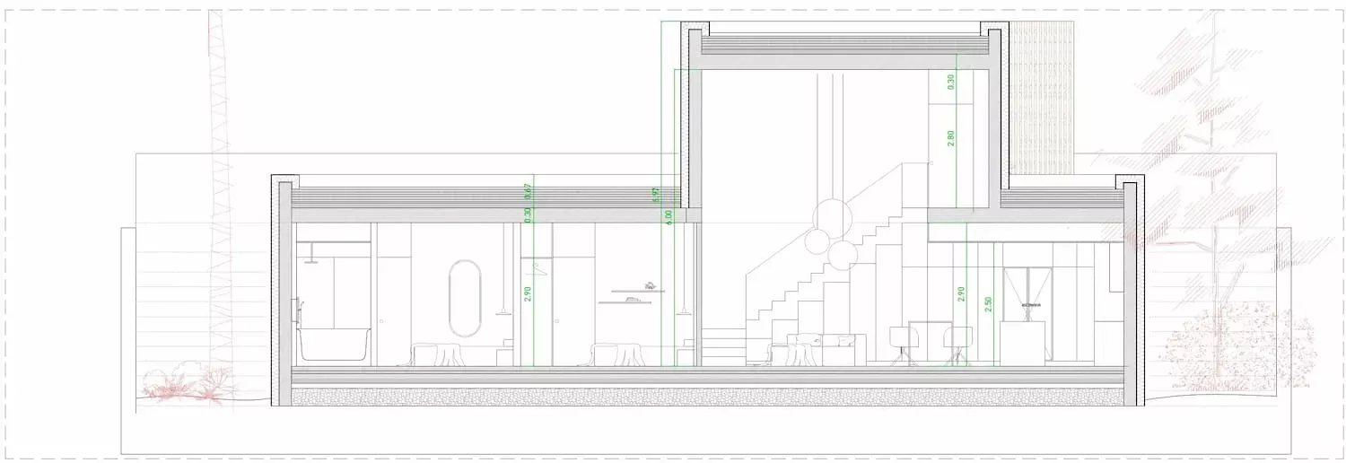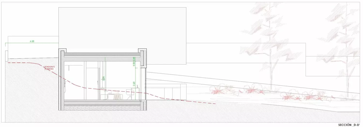 El desnivel existente en la parcela se aprovechó para la creación de una vivienda escalonada que sacaba el máximo partido a cada nivel y minimizaba el sobrecoste de las excavaciones que se debían realizar. De esta forma, la mayor parte del programa de la vivienda se encontraba semienterrada permitiendo situar los espacios interiores a la misma cota que los espacios exteriores de la parcela. El semisoterramiento ayuda, desde el punto de vista de la eficiencia energética, a la disipación de las cargas internas en verano, y reduce la exposición en invierno. También, en este caso, aumentaba la privacidad de los espacios exteriores, cuestión importante para los promotores.El diseño de los espacios interiores debía tener un aire industrial y muy funcional, en el que el hormigón y el hierro fueran protagonistas.