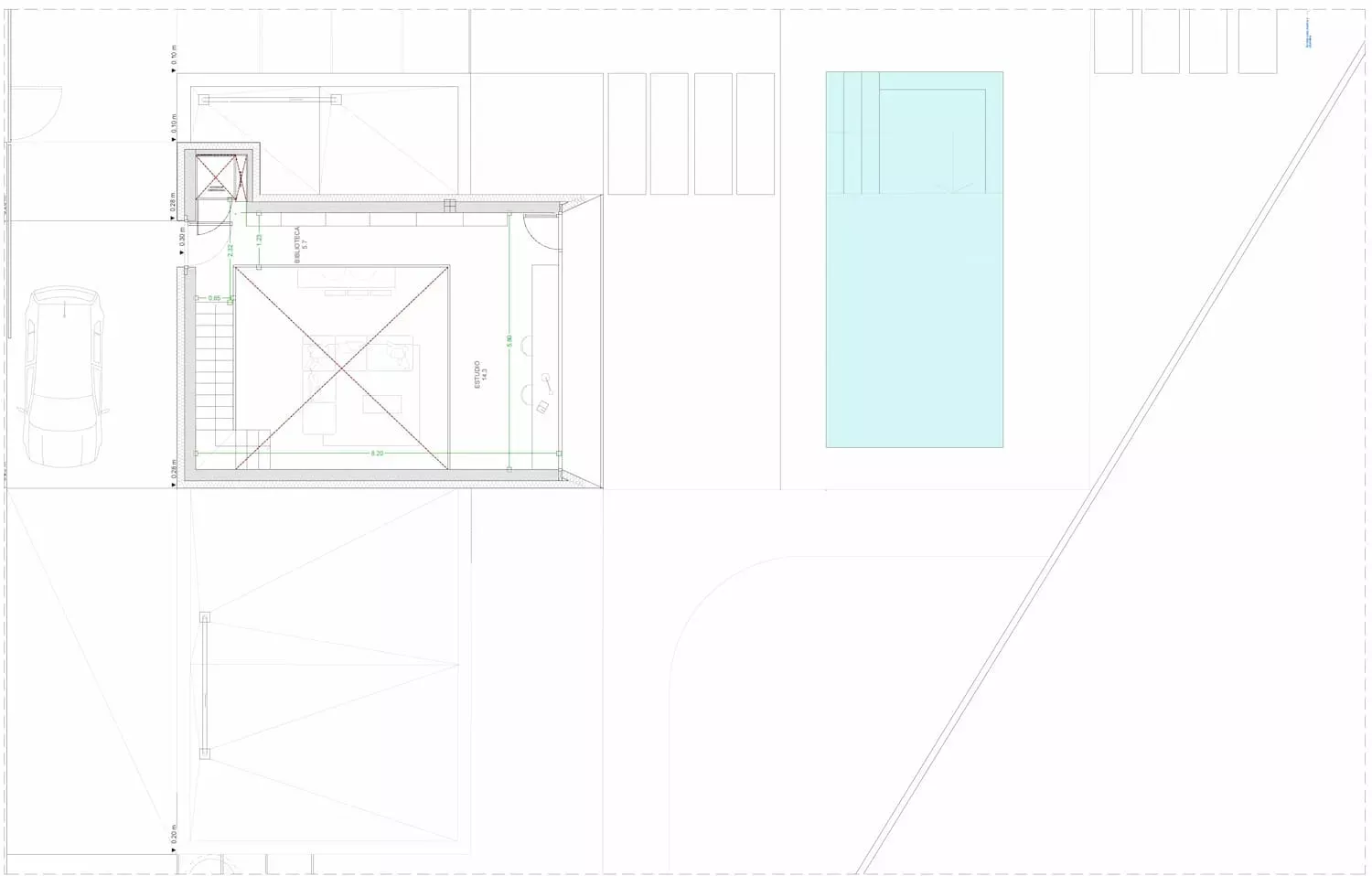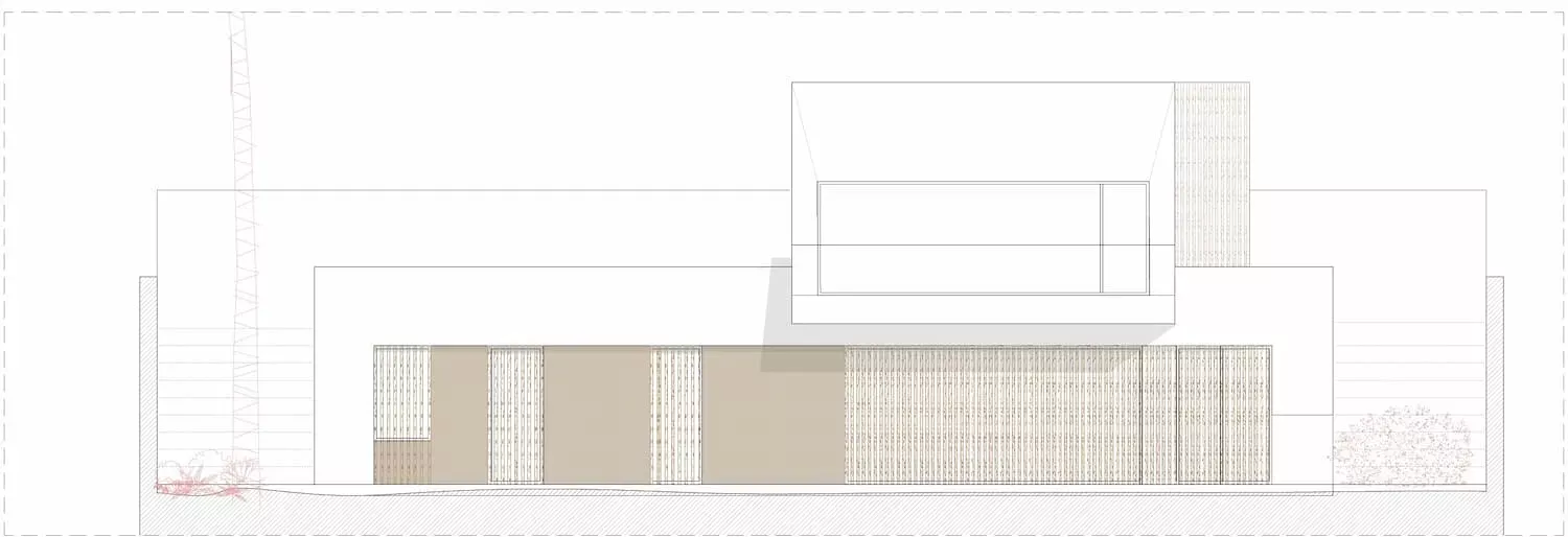 A la altura de la cota del viario, se desarrollaba la zona de aparcamiento y se sitúa la entrada de la vivienda, volcada a doble altura sobre la zona de día y que da acceso a un mirador que ofrece vistas del paisaje que ofrece la zona y donde se ubica la zona de estudio. Como gran parte de la cubierta de la vivienda se sitúa en este nivel, se aprovechó su extensión para desarrollar un huerto que diera servicio a la vivienda.