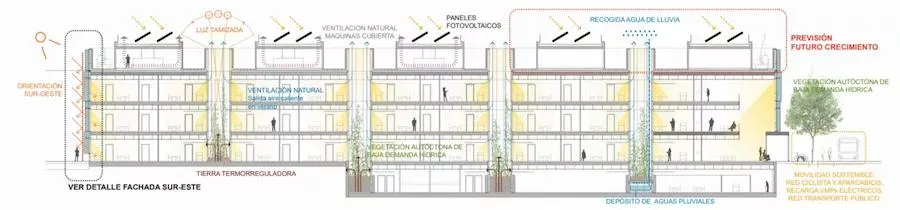 Además, se optó por una fachada cerámica, de km 0 y materiales reciclados y reciclables. También se estudió la gestión del agua de lluvia y de aguas grises para su reaprovechamiento dentro de las instalaciones.