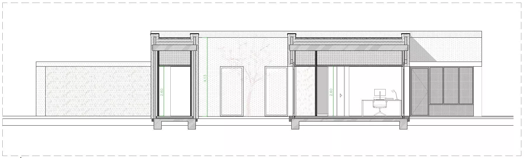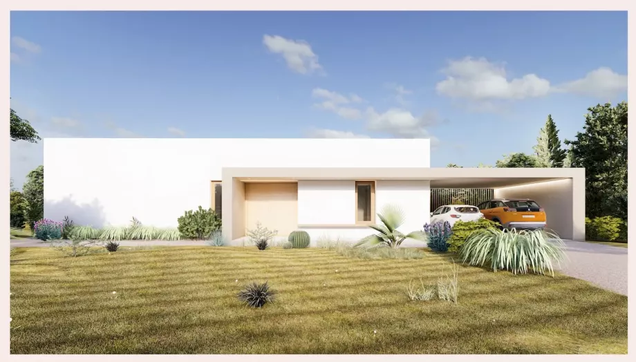 La vivienda se orienta a sur, para cerrarse al resto de orientaciones. Para la protección solar se plantean unos porches sin techado preparados para que sean cubiertos por vegetación trepadora.